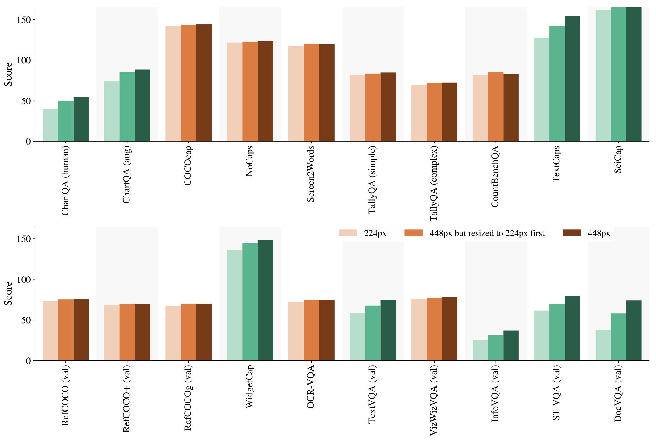 As we can clearly see, a lot (but not all) of the improved performance at 448px² comes from the increased capacity. For example, the improved ChartQA results can almost entirely be attributed to capacity increase, not resolution increase.