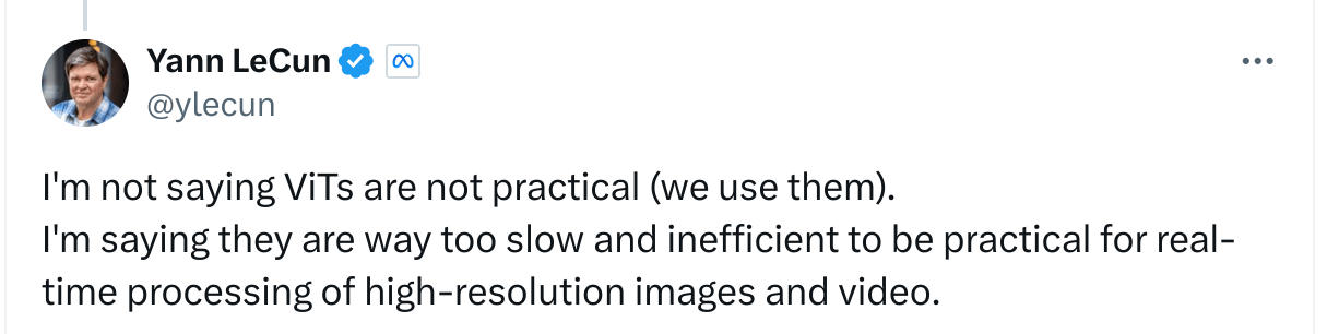 It is often stated that because of the quadratic self-attention, ViTs aren't practical at higher resolution. As the most prominent example, here is Yann LeCun, Godfather of CNNs, stating the following: